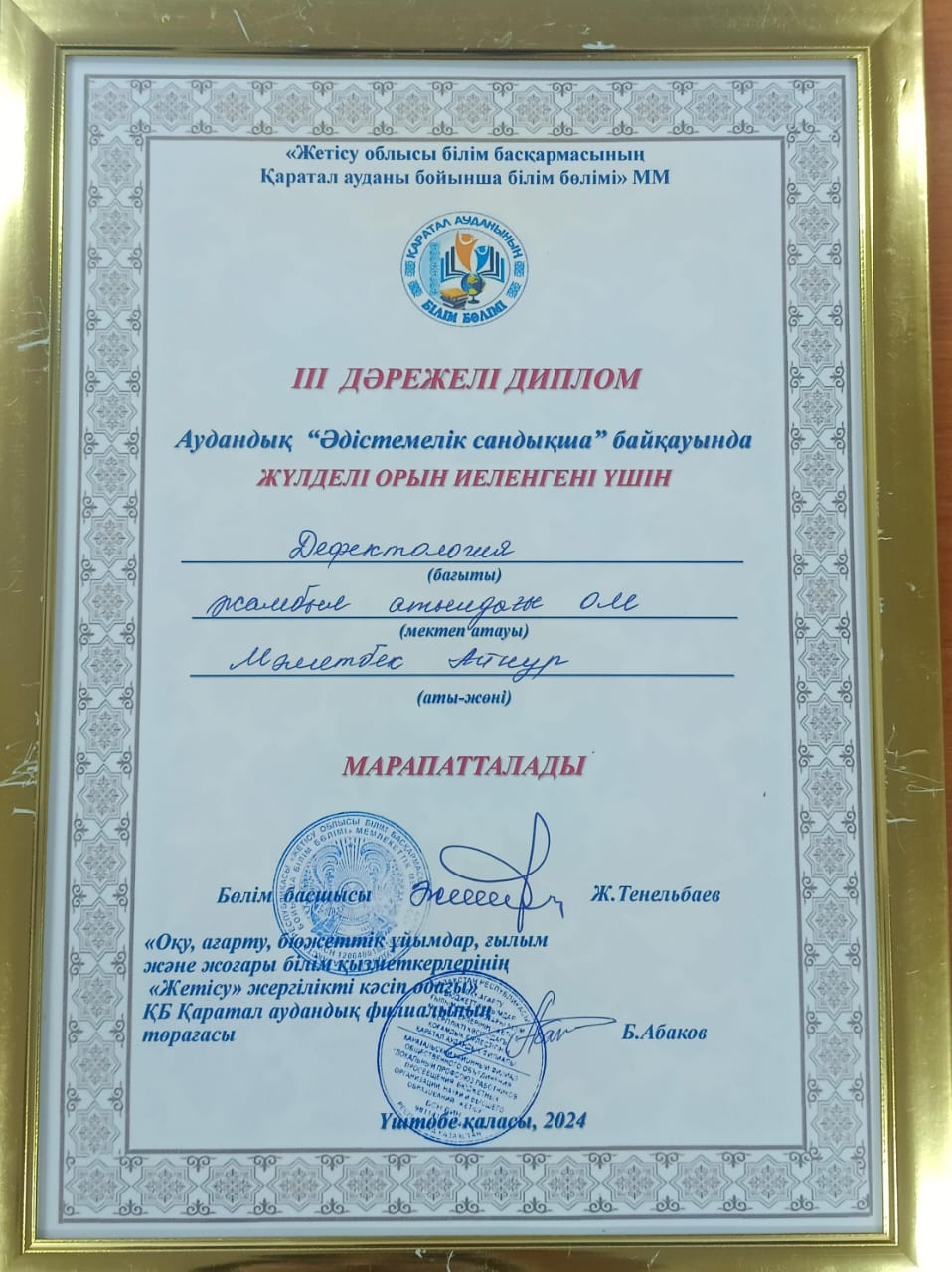 Жамбыл атындағы орта мектеп » Біз туралы » Жетістіктеріміз » Құттықтаймыз!!! 22-ші қазан күні аудандық "Әдістемелік сандықша"конкурсында мектеп дефектологі Мәметбек Айнұр жүлделі 3-орынды иеленді.Шығармашылық табыс тілейміз! алар асуларыңыз көп болғай...