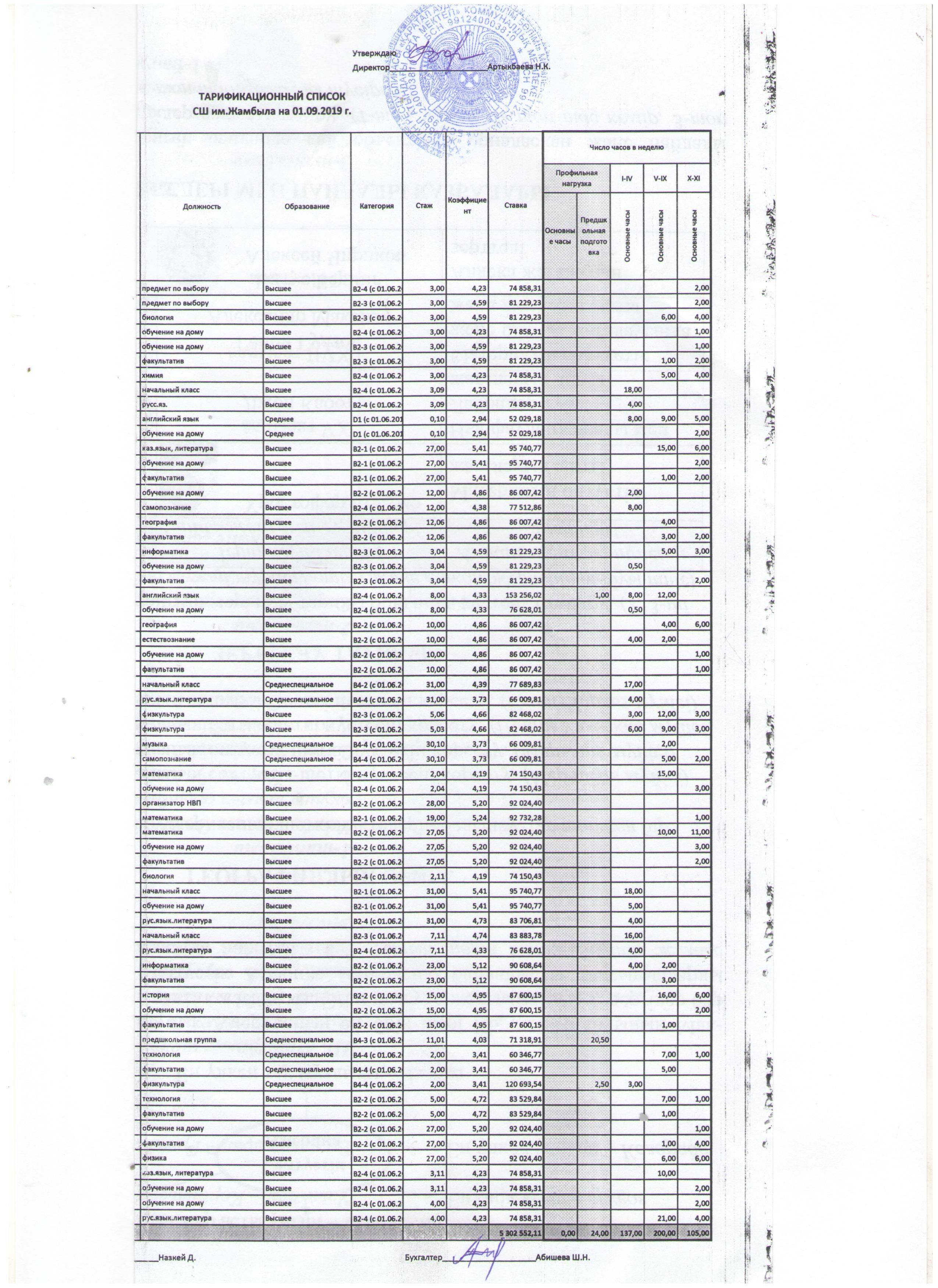 Жамбыл атындағы орта мектебінің тарификациясы 2019-2020 оқу жылы