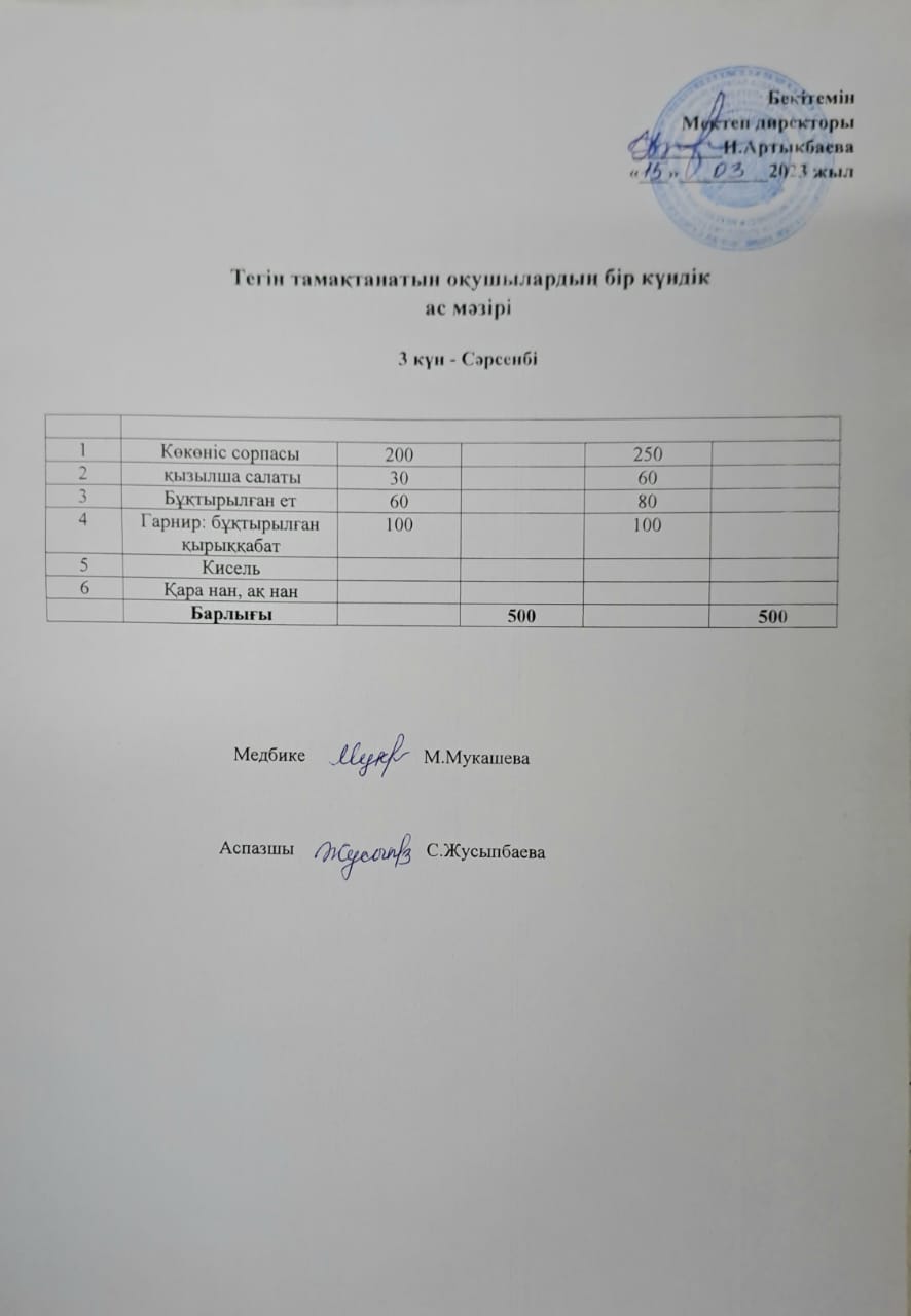 Тегін тамақтанатын оқушылардың бір күндік ас мәзірі » Жамбыл атындағы орта мектеп