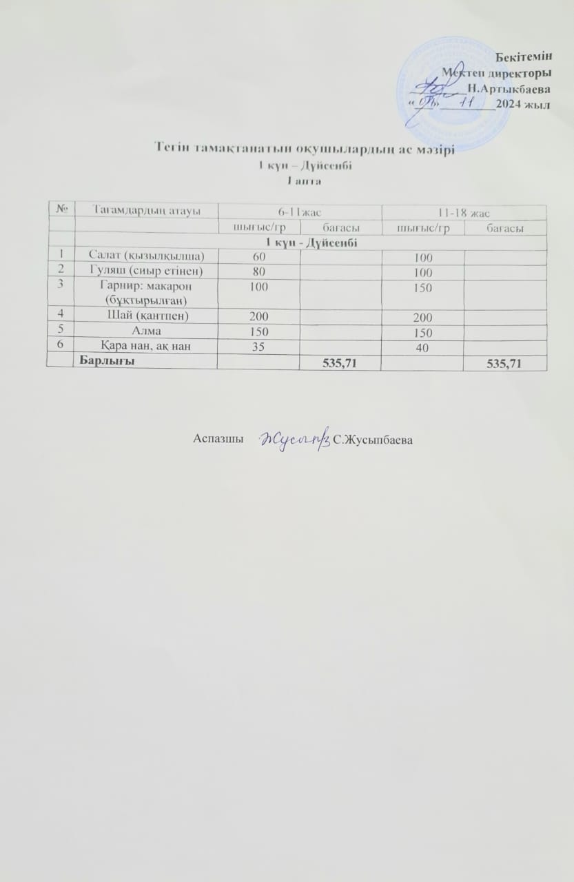 Тегін тамақтанатын оқушылардың бір күндік ас мәзірі » Жамбыл атындағы орта мектеп