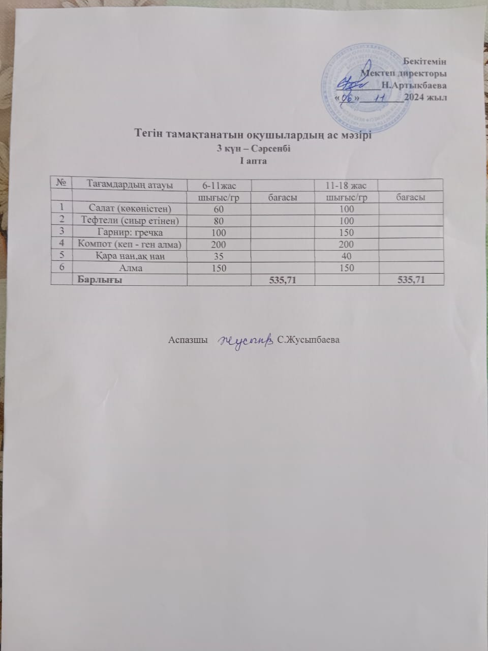 Тегін тамақтанатын оқушылардың бір күндік ас мәзірі » Жамбыл атындағы орта мектеп
