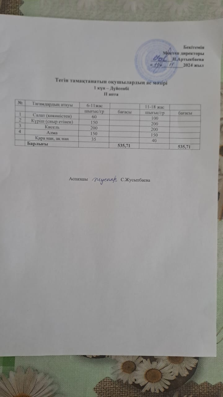 Тегін тамақтанатын оқушылардың бір күндік ас мәзірі » Жамбыл атындағы орта мектеп