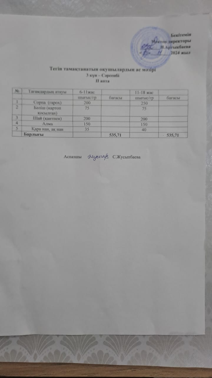 Тегін тамақтанатын оқушылардың бір күндік а с мәзірі » Жамбыл атындағы орта мектеп