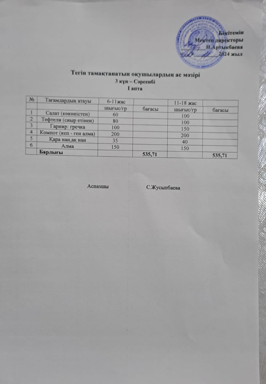 Тегін тамақтанатын оқушылардың ас мәзірі » Жамбыл атындағы орта мектеп