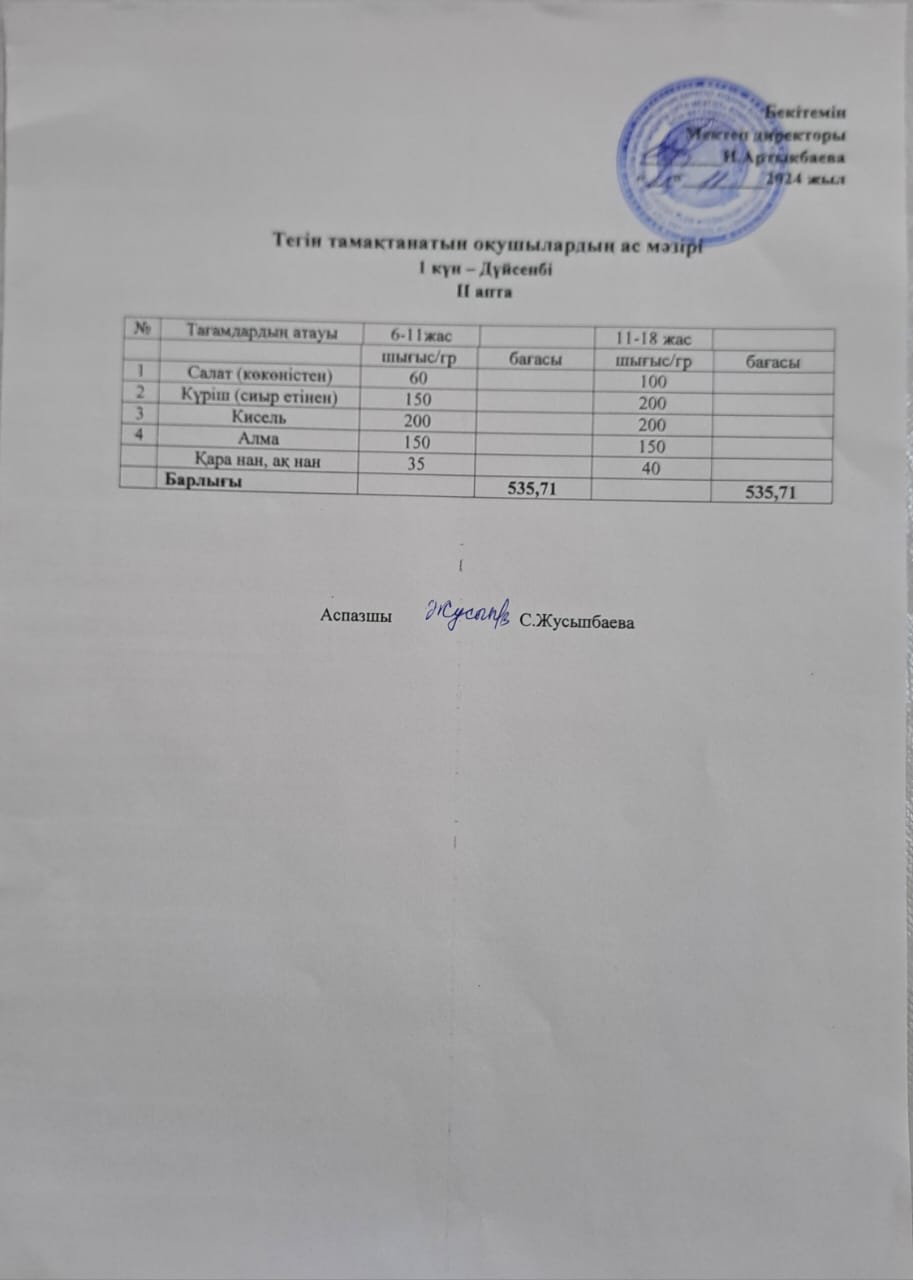 Тегін тамақтанатын оқушылардың бір күндік ас мәзірі » Жамбыл атындағы орта мектеп