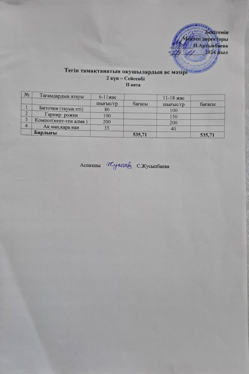 Тегін тамақтанатын оқушылардың бір күндік ас мәзірі » Жамбыл атындағы орта мектеп