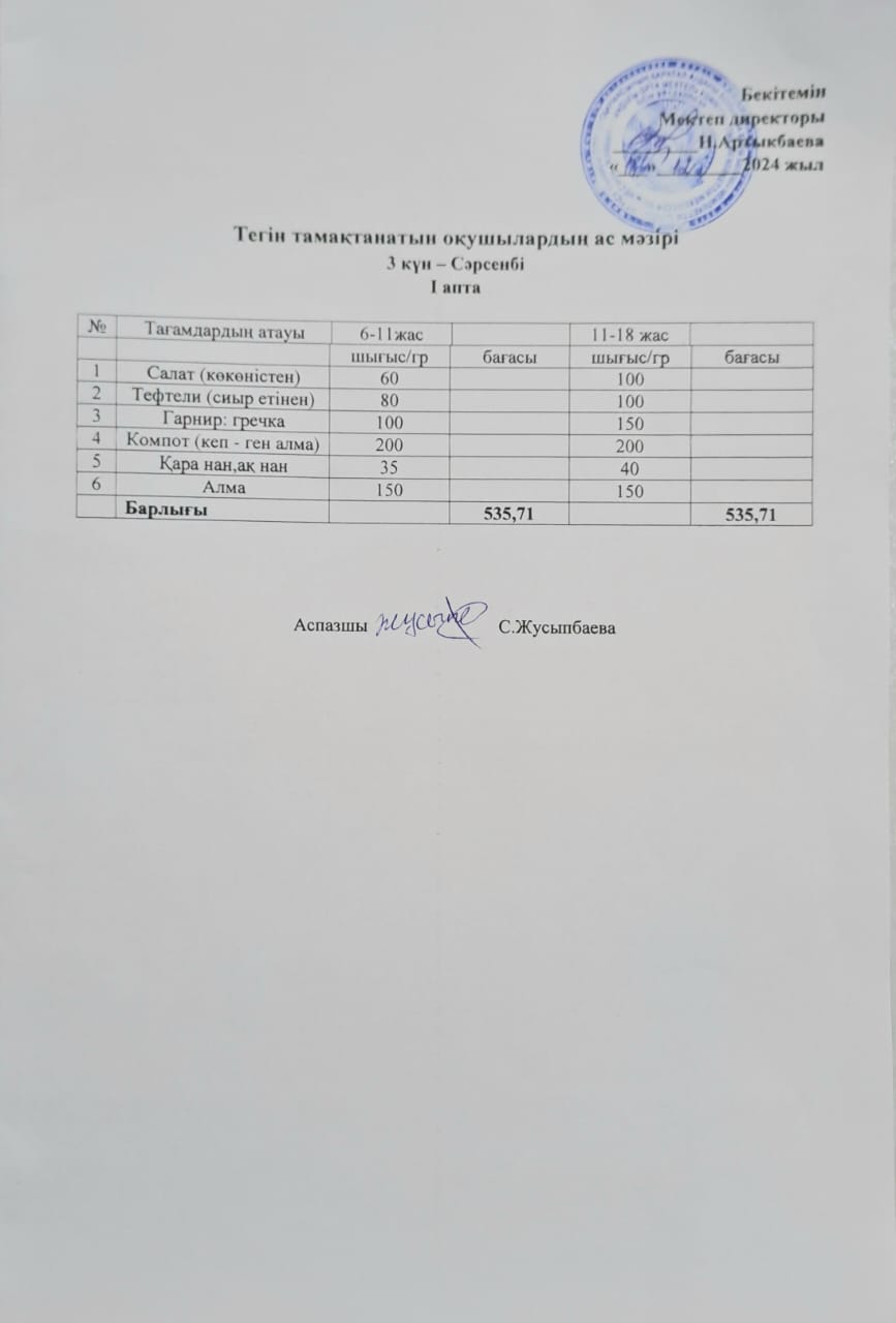 Тегін тамақтанатын оқушылардың бір күндік ас мәзірі » Жамбыл атындағы орта мектеп