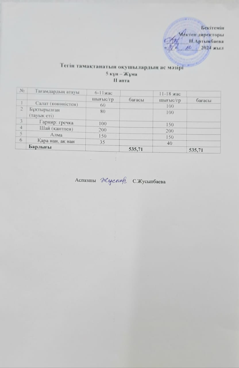 Тегін тамақтанатын оқушылардың бір күндік ас мәзірі » Жамбыл атындағы орта мектеп