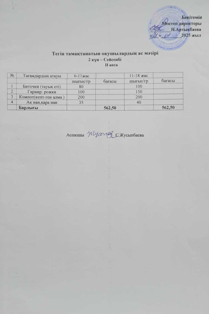 Тегін тамақтанатын оқушылардың бір күндік ас мәзірі » Жамбыл атындағы орта мектеп