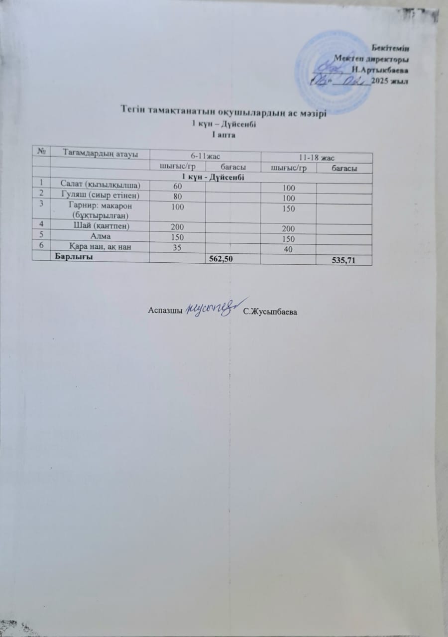 Тегін тамақтанатын оқушылардың бір күндік ас мәзірі » Жамбыл атындағы орта мектеп