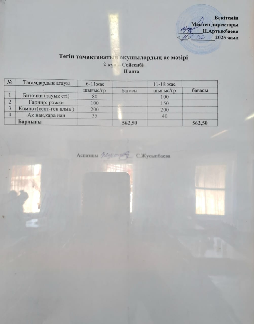Тегін тамақтанатын оқушылардың бір күндік ас мәзірі » Жамбыл атындағы орта мектеп