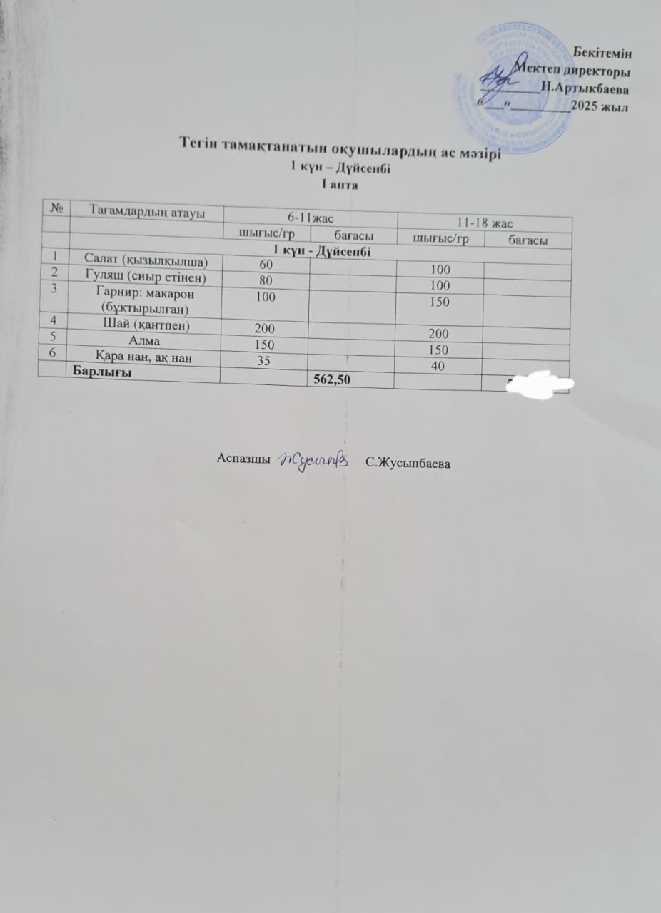 Тагін тамақтанатын оқушылардың бір күндік ас мәзірі » Жамбыл атындағы орта мектеп