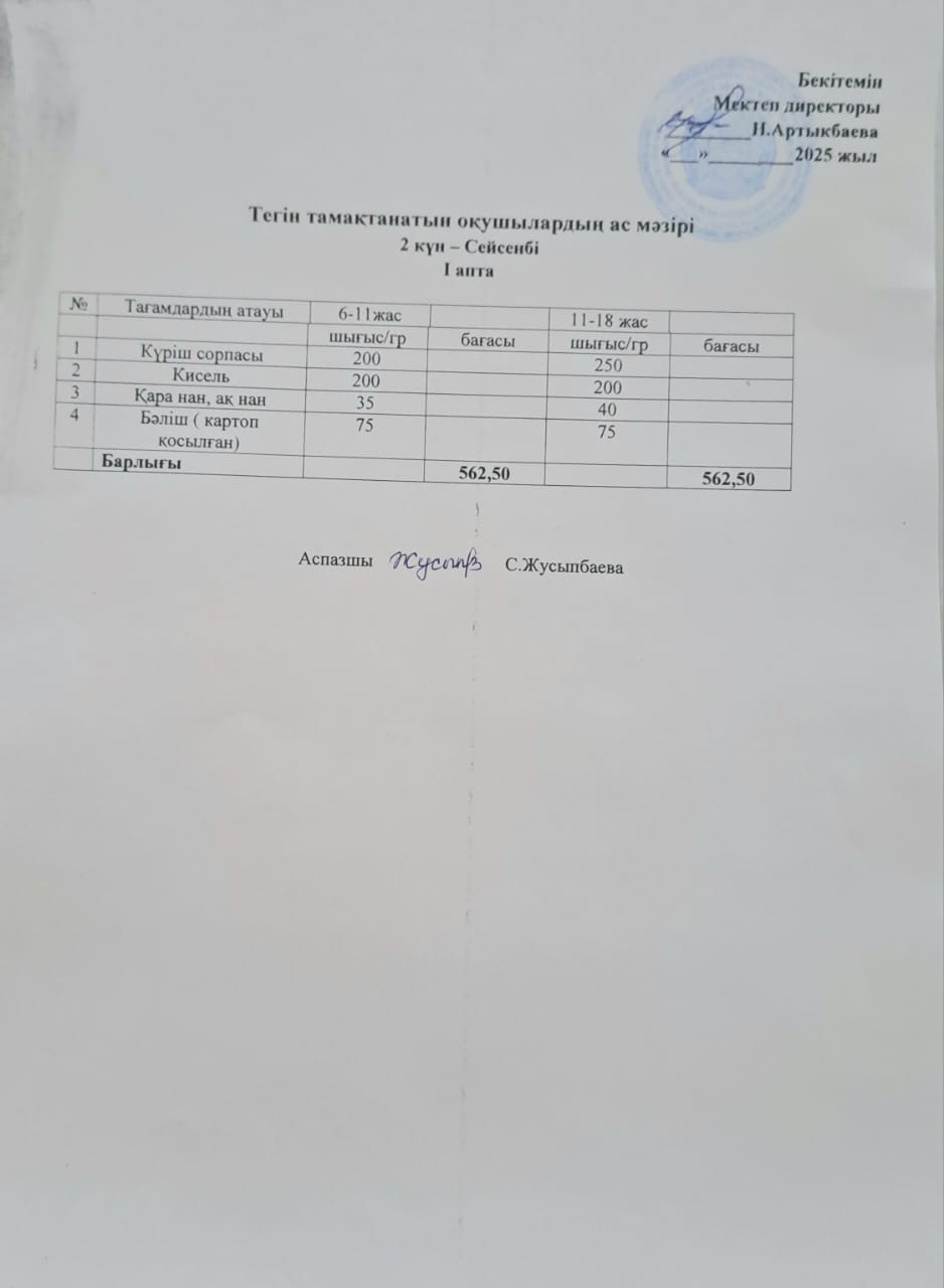 Тегін тамақтанатын оқушылардың бір күндік ас мәзірі » Жамбыл атындағы орта мектеп