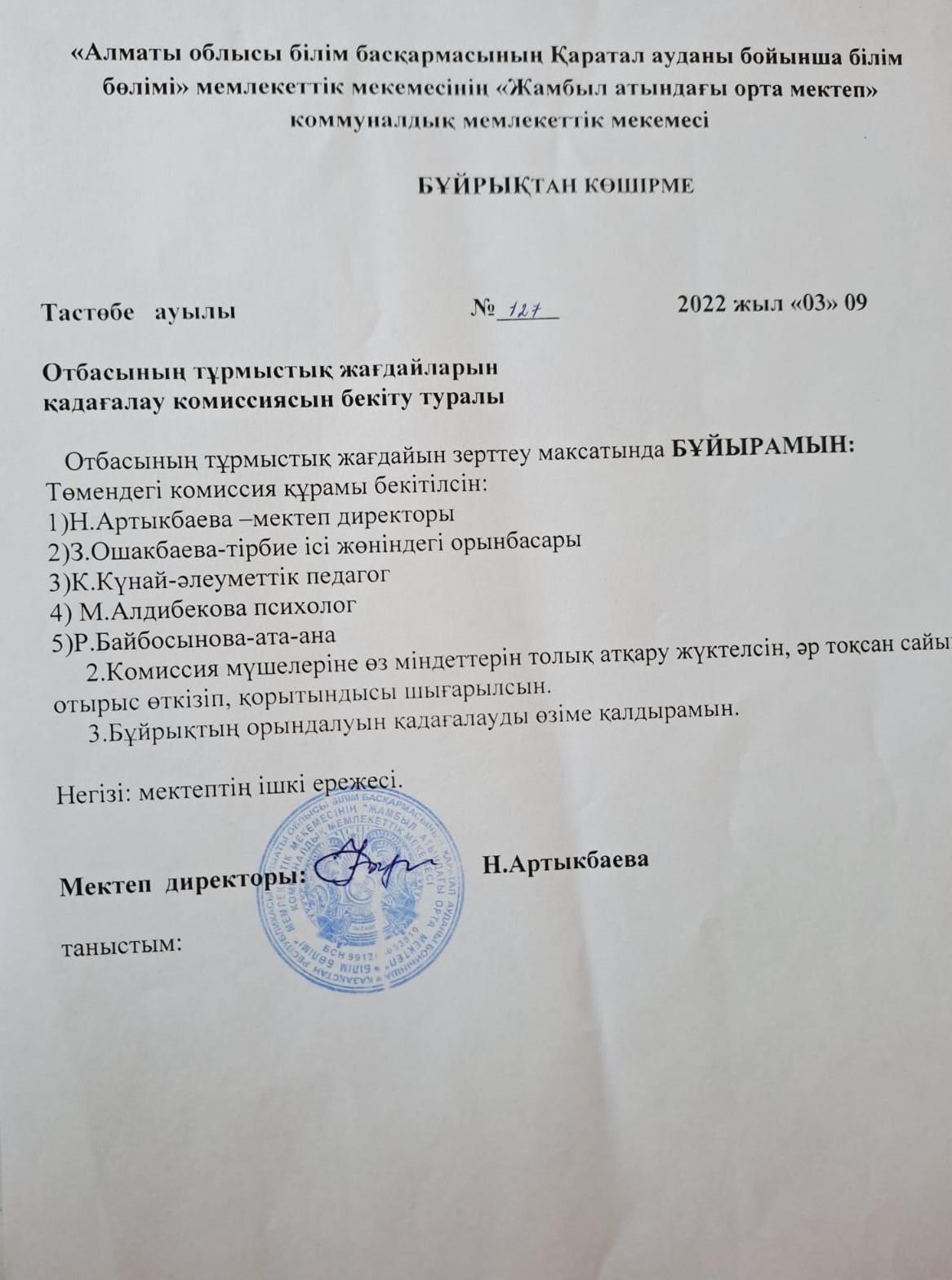 Отбасының тұрмыстық жағдайын қадағалау комиссиясын бекіту туралы » Жамбыл атындағы орта мектеп