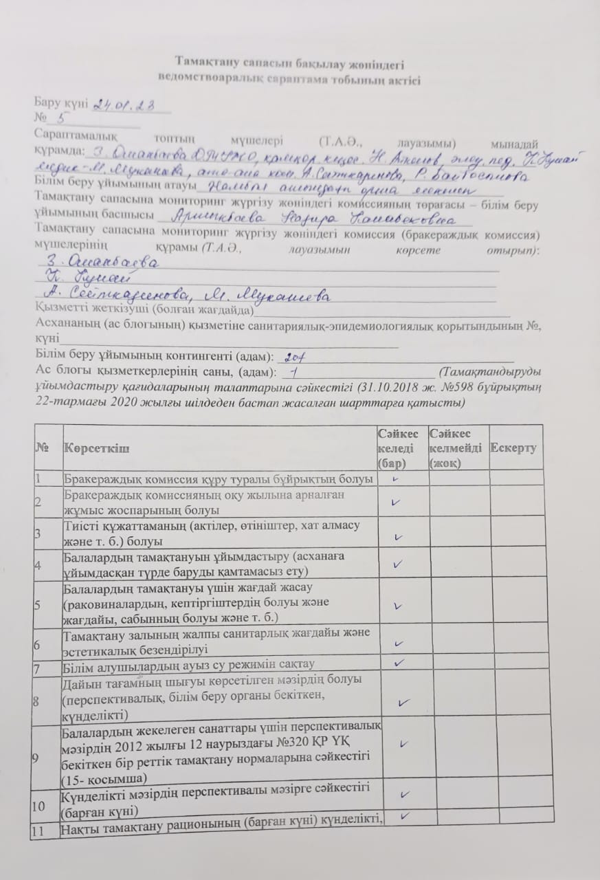 24 январь 2023 0 1 2 3 4 5 Тамақтану сапасы мониторингісін жүргізу жөнінде бракераж комиссиясының №5 АКТсі