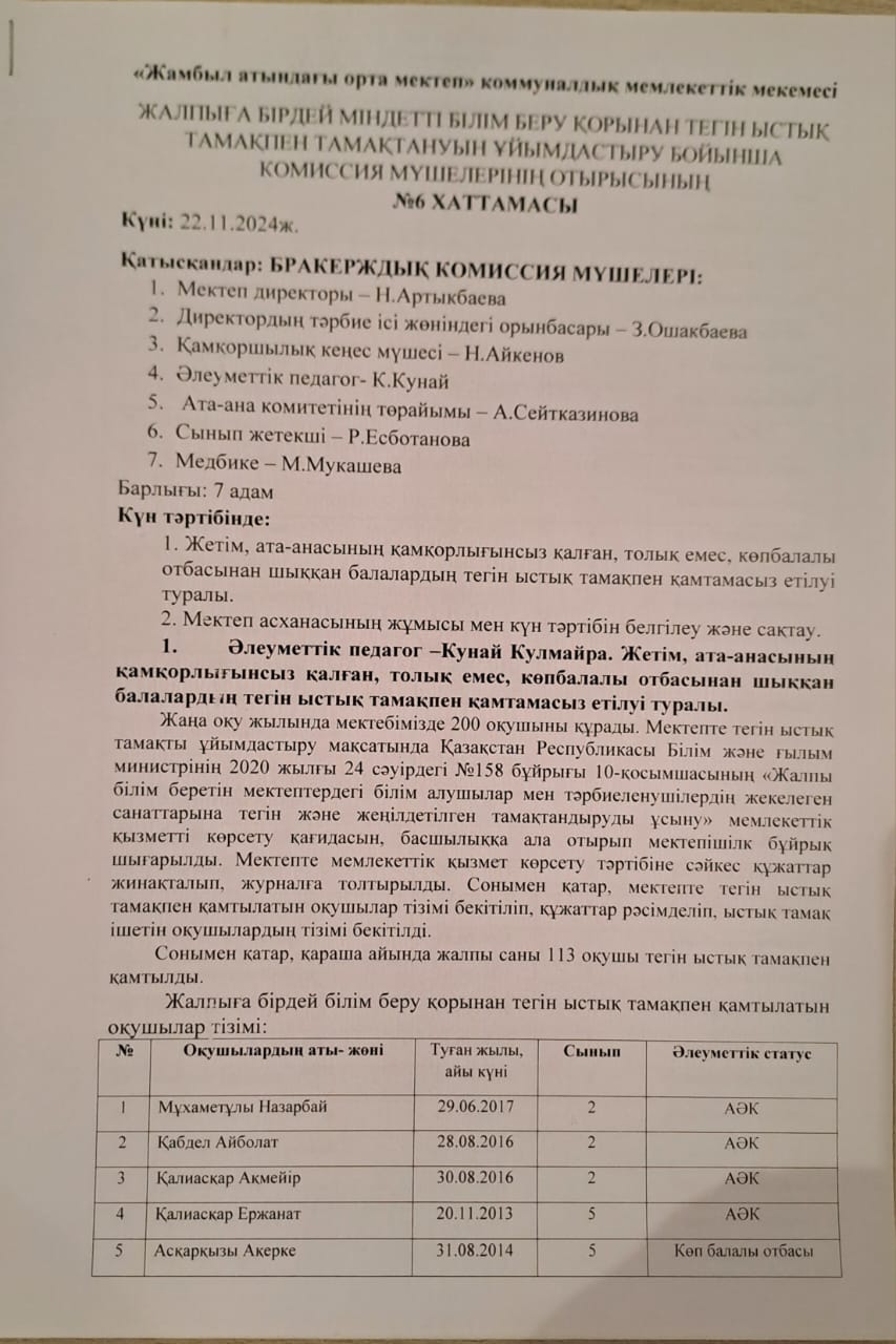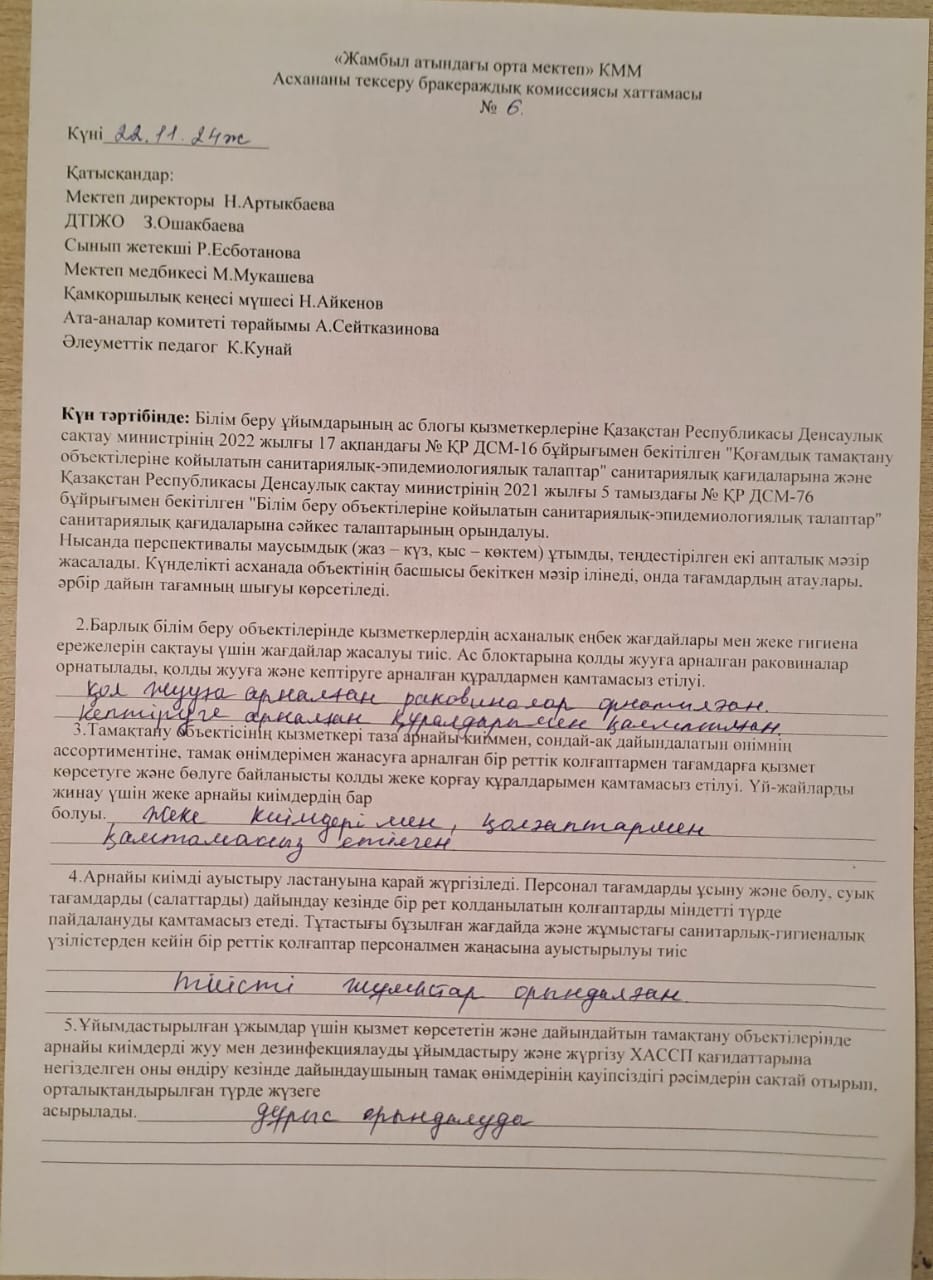 Бракераж комиссия мүшелерінің асхана жұмысын мониторингілеу » Жамбыл атындағы орта мектеп